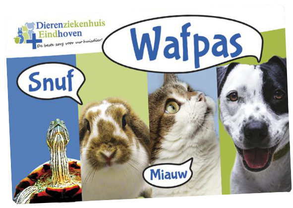 De Wafpas is de betaalpas voor je huisdieren. Je zet er eenvoudig tegoed op via een online betaling via iDeal. Met de Wafpas betaal je bij Dierenziekenhuis Eindhoven je rekening. Dat kan zijn voor een consult, een behandeling of medicijnen; Maar eigenlijk alles wat bij de dierenarts te koop is. Door je Wafpas op te waarderen bepaal je zelf je voordeel. Kies voor een gratis product of gratis dienst tijdens het opwaarderen van je Wafpas. Zo bepaal je zelf hoeveel korting je krijgt op de rekening. Je korting kan behoorlijk oplopen! Vraag snel een Wafpas aan en zet er tegoed op.